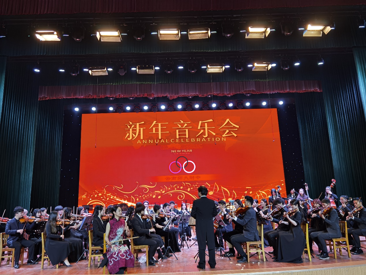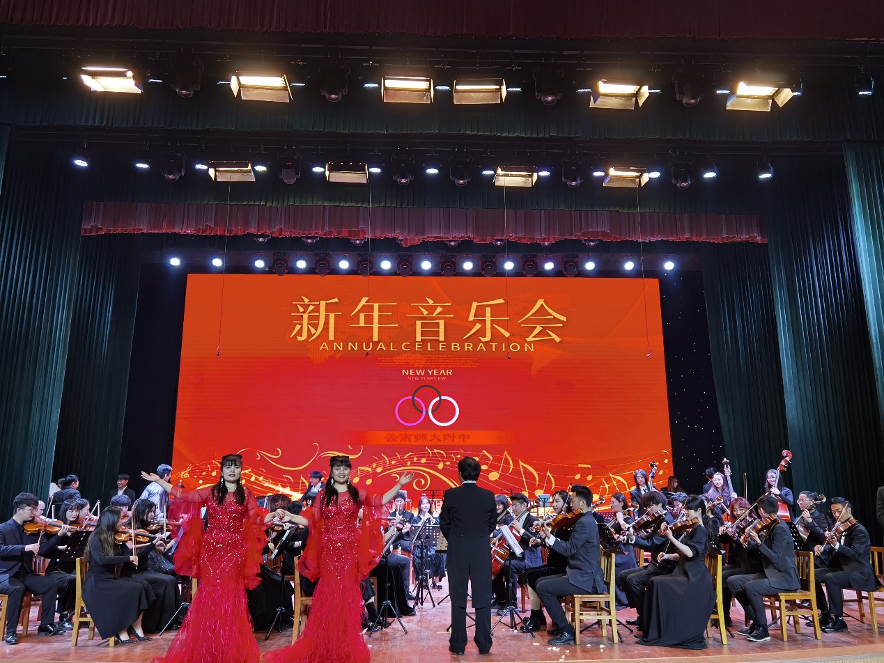 本次“高雅艺术进校园”不仅是伟德国际victor1946为云南师范大学附属中学奉献的一场新年音乐会,更是一场别具风格的音乐之旅。音乐会由师向宁教授为师附师生进行导赏,并对其介绍了管弦乐团的乐器组成、主要乐器的音色特点、表现特征等,引导师生欣赏贝多芬《第五交响曲》《乔家大院》等中西经典乐队及声乐作品。演出由管弦系主任周力副教授指挥,伟德国际victor1946艾然副教授、曹智武、张双双、张菲菲和闫润辉担任独奏或独唱。
