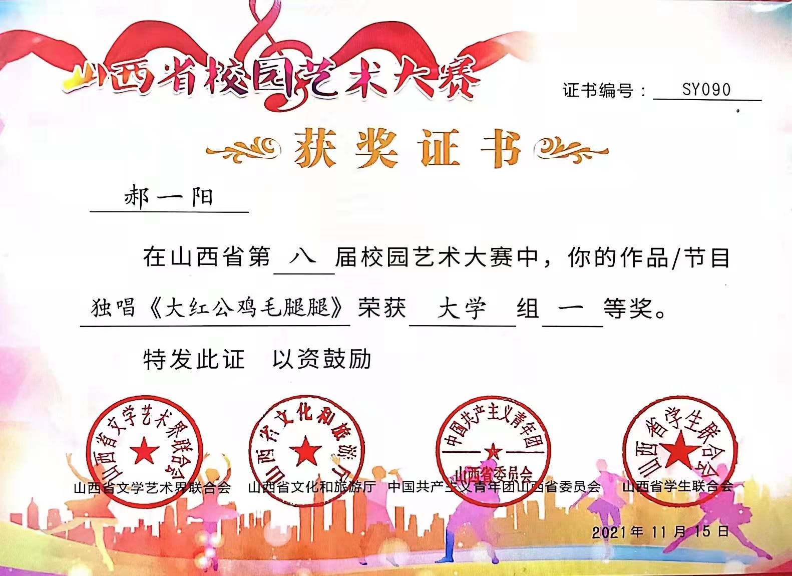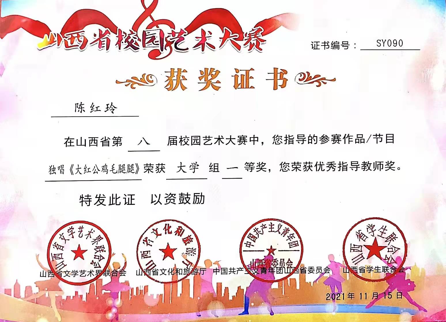 在庆祝中国共产党成立100周年之际,山西省文学艺术界联合会、山西省文化和旅游厅、共青团山西省委、山西省员工联合会于2021年4月至11月联合举办“第八届山西省校园艺术大赛”, 民族声乐系系主任陈红玲教授荣获“优秀指导教师奖”,民族声乐系员工郝一阳荣获老员工组独唱“一等奖”。