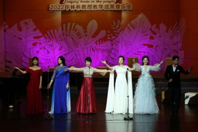 员工教学成果展示结束后,林林教授发言讲话并与全体员工共同演唱《美人》。从《听见·美人——林林和她的朋友们》到本次“林歌林鹊——林林和她的员工们”,观众的情绪从享受云南少数民族独具一格的音乐风格到感动于师若家慈呕心智、黉门数载不言苦的师生情。