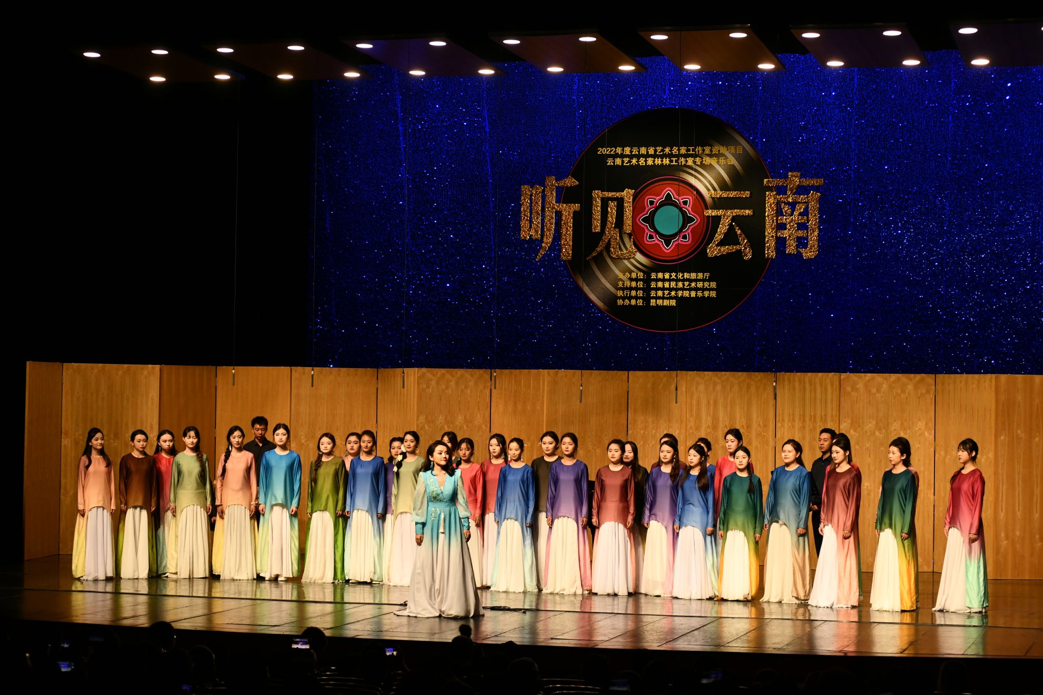 艺术名家林林工作室专场音乐会《听见云南》共计14首歌曲,既有根据云南民歌小调改编的耳熟能详的作品《美人》《弥渡山歌》《白月亮白姐姐》《新放马山歌》《螃蟹调》,也有云南优秀创作作品《寻找太阳升起的地方》《来香巴拉看太阳》《盼》《呢沓少》《打歌》《你我哥俩个》《梦里我曾回去过》《远方》《纳西古调—一寻》;既有云南资深的作曲家陈勇、刘晓耕、万里、吴渝林、业原、李鹏,周国庆,也有云南新一代有影响力的作曲家李树琼,邓波、高红杨、冷重文等;既有云南白族、藏族、撒尼族、彝族、纳西族等民歌的展示,还有汉族的花灯及艺术歌曲的呈现。整场音乐会的作品无论是钢琴与民间乐器的搭配,还是表演与人声效果的辉映;无论是民族音调与现代技法的融汇,还是色彩乐音与常规音色的柔和,都显现出作曲家们对云南各民族音乐的不凡的追求和功力。