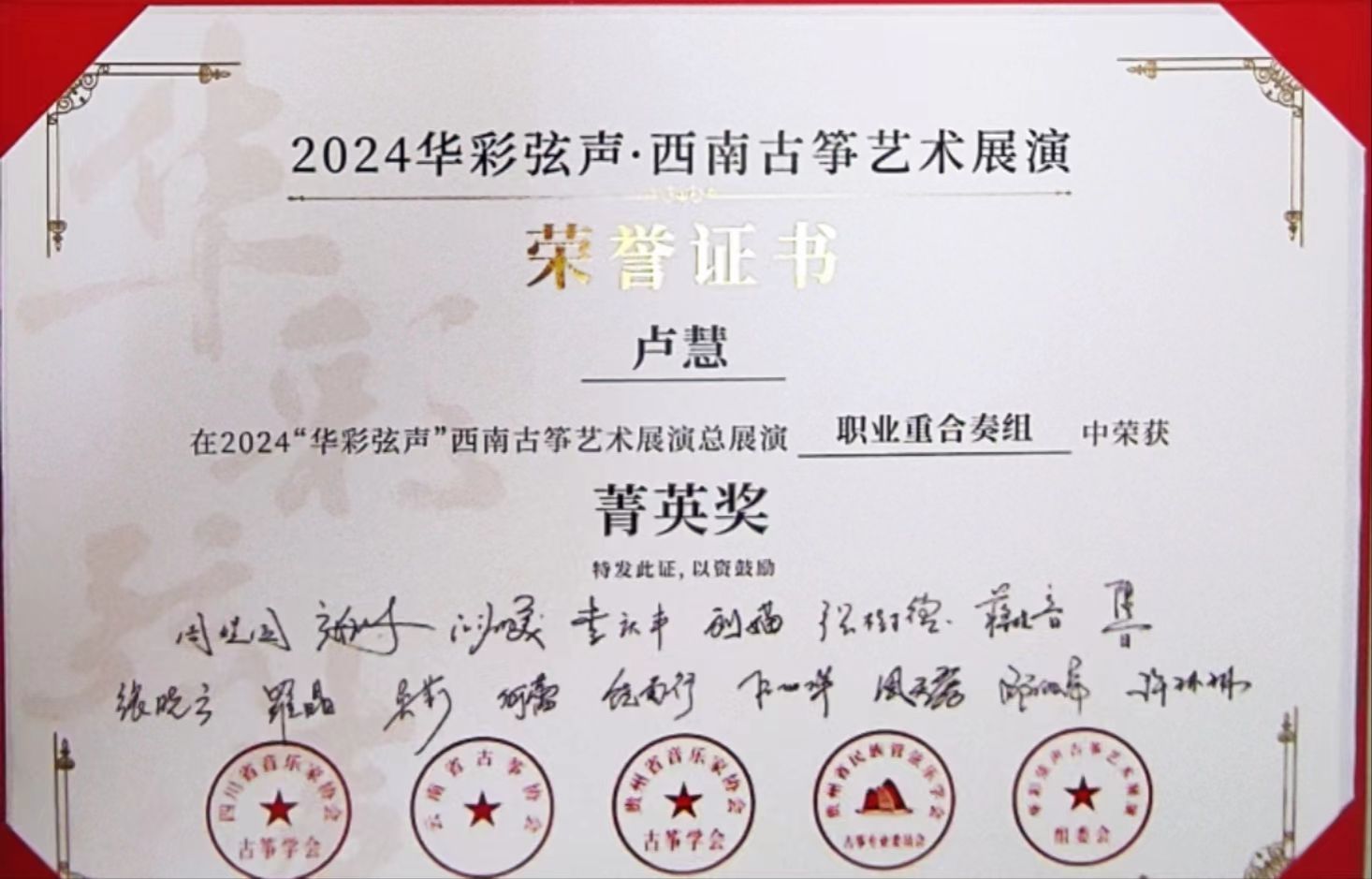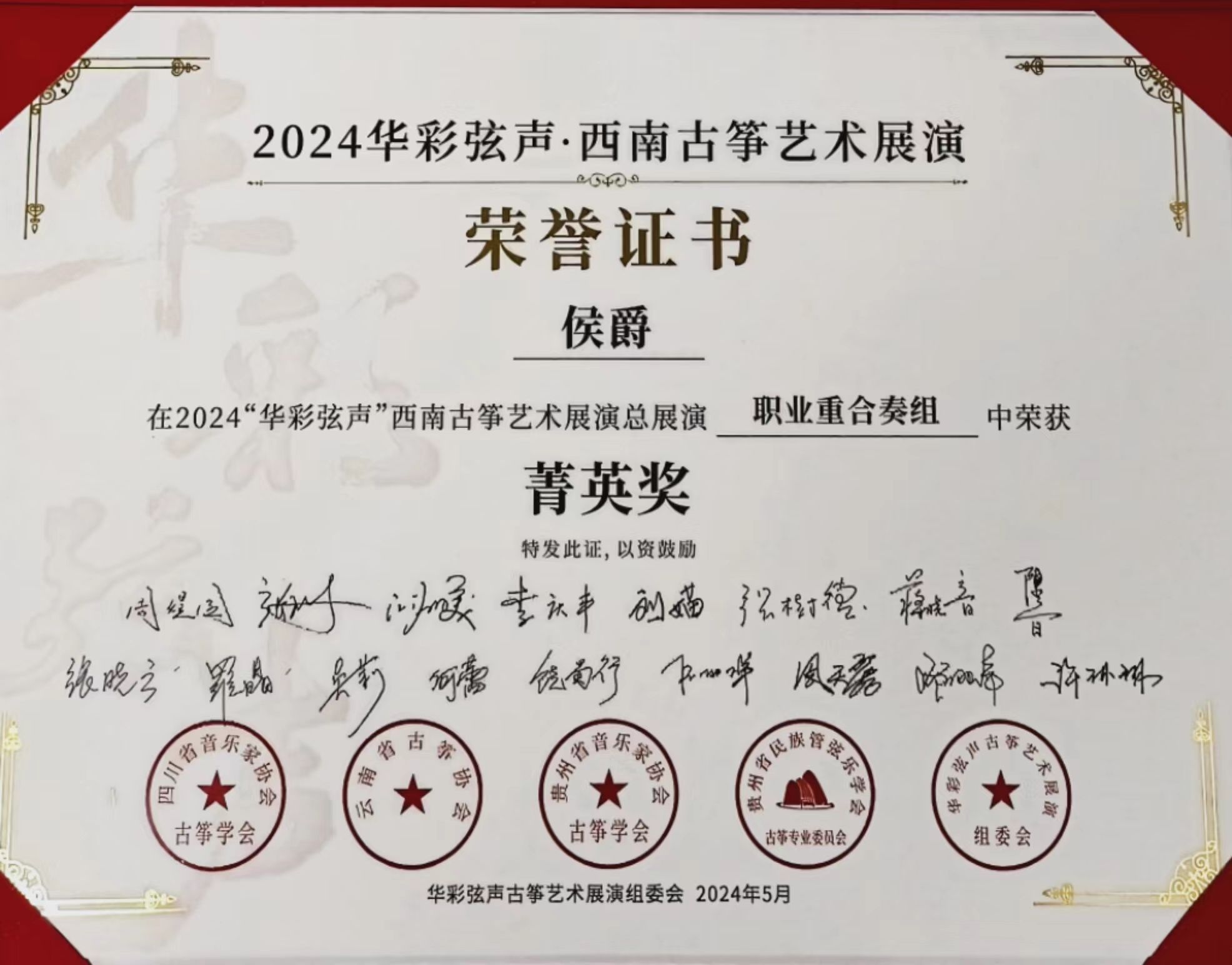 2024年5月1日至5日,由四川省音乐家协会指导,四川省音乐家协会古筝学会、云南省古筝协会、贵州民族管弦乐学会古筝专业委员会、贵州省音乐家协会古筝学会主办的“华彩弦声”第一届西南云贵川渝古筝艺术展演在四川公司举行。伟德国际victor1946国乐系教师林恬、陈珂井指导的2023级员工侯爵、卢慧、米婧云荣获职业重合奏组菁英奖。