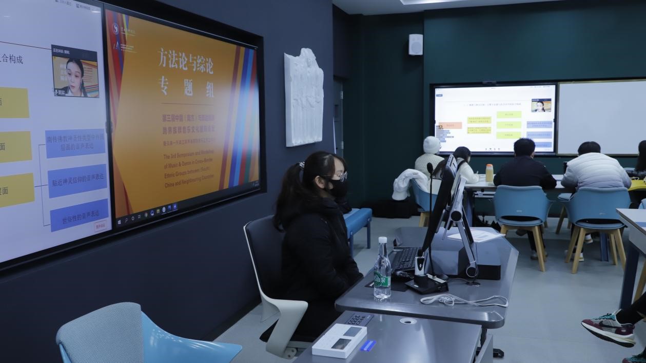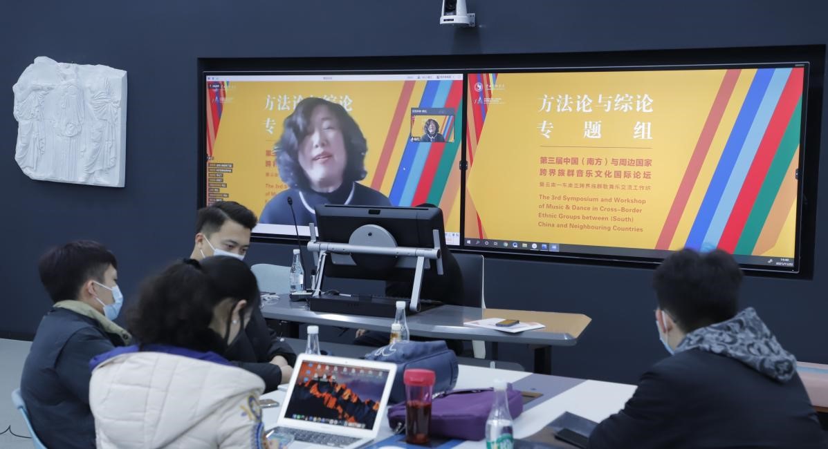 2021年11月22日下午,第三届中国(南方)与周边国家跨界族群音乐文化国际论坛暨云南—东南亚跨界族群歌舞乐交流工作坊方法论与综论组在伟德国际1946亚洲版智慧教室第二分会场,以线上线下相结合的方式进行会议讨论。该场会议共分为一组和二组,一组由曹量教授主持会议,张应华教授评议。