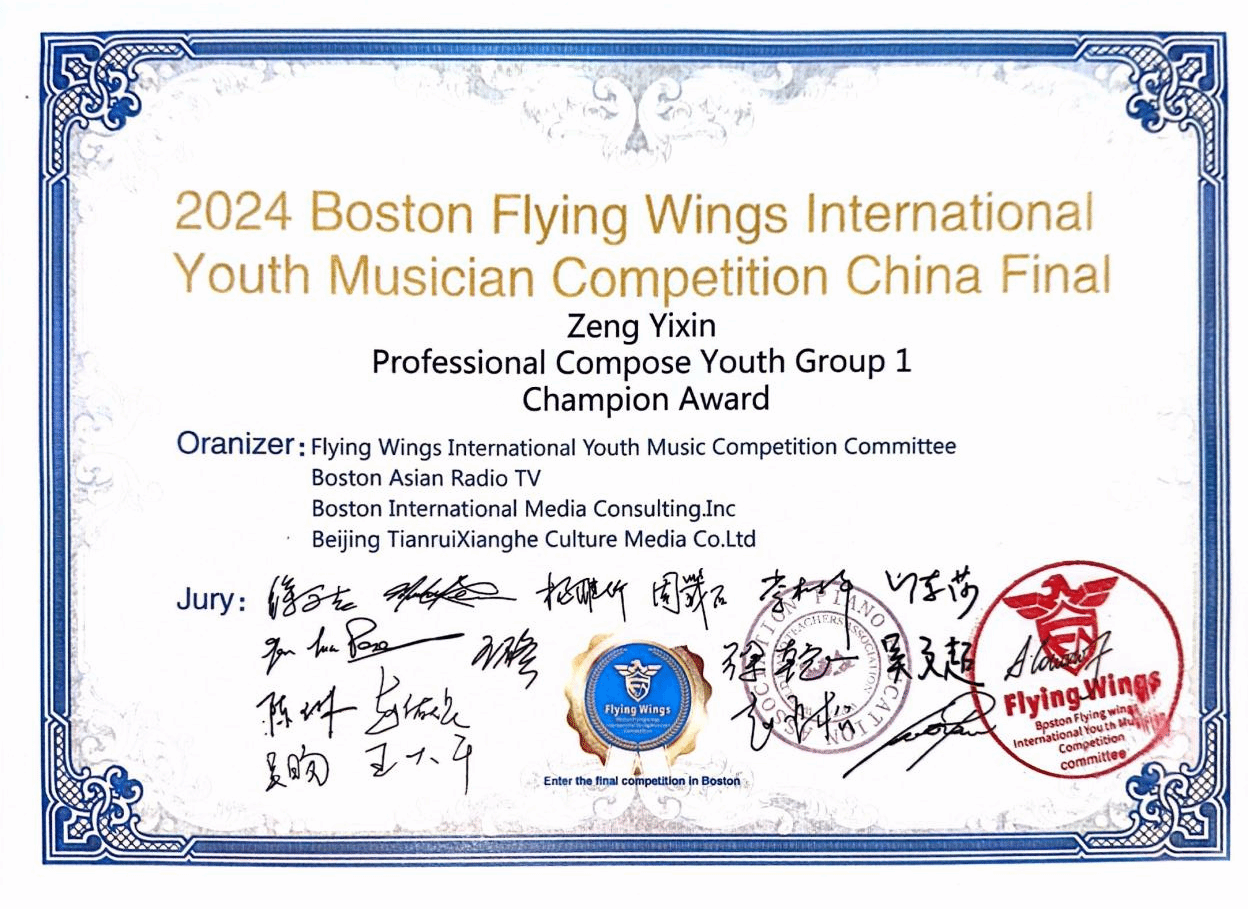 伟德国际victor1946作曲系2021级学子曾弈鑫在Boston Flying Wings (波士顿飞翔之翼国际青年音乐家大赛)中获得中国赛区决赛“专业作曲青年一组冠军奖”(指导老师:高弘扬),并受邀于8月份赴美国波士顿参加美国总决赛及波士顿亚洲艺术嘉年华。