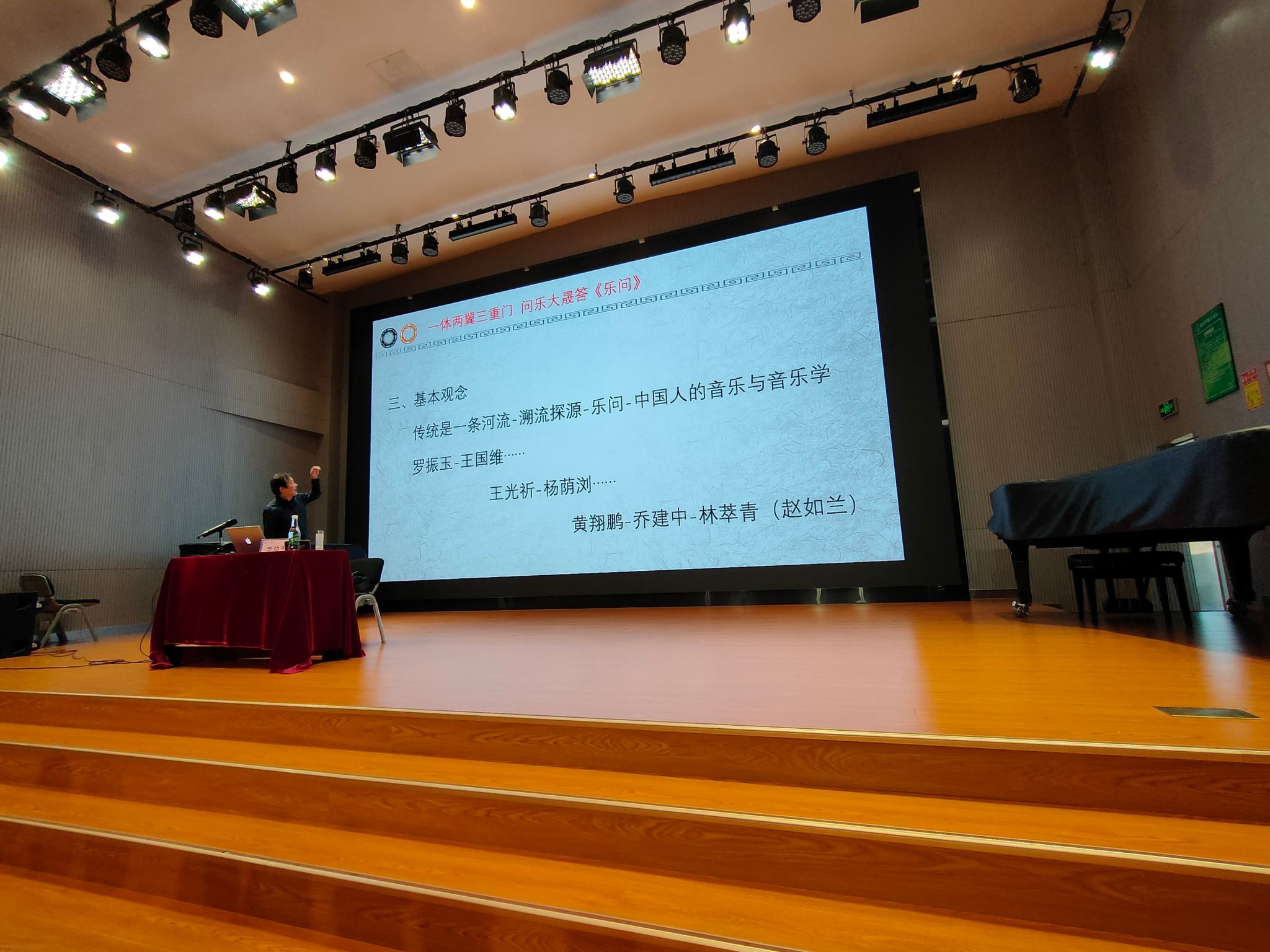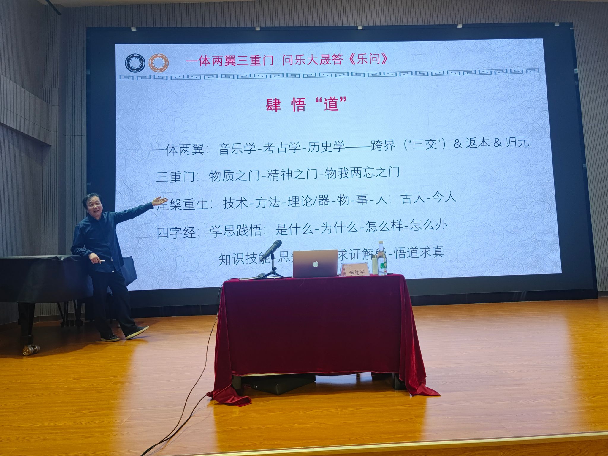 李幼平教授以个人博士论文《大晟钟与宋代黄钟标准音高研究》中,采用“音乐史的选题、考古学的方法回答了历史学问题”这一实际案例,阐述本次讲座以音乐学为体、历史学与考古学为两翼,将物质之门、精神之门、物我两忘之门为三重之门的治学之道,引导公司师生在学术实践中结合本专业特色的同时做到创新性转换和创造性发展,注重学术内涵的同时探究其实际运用价值。