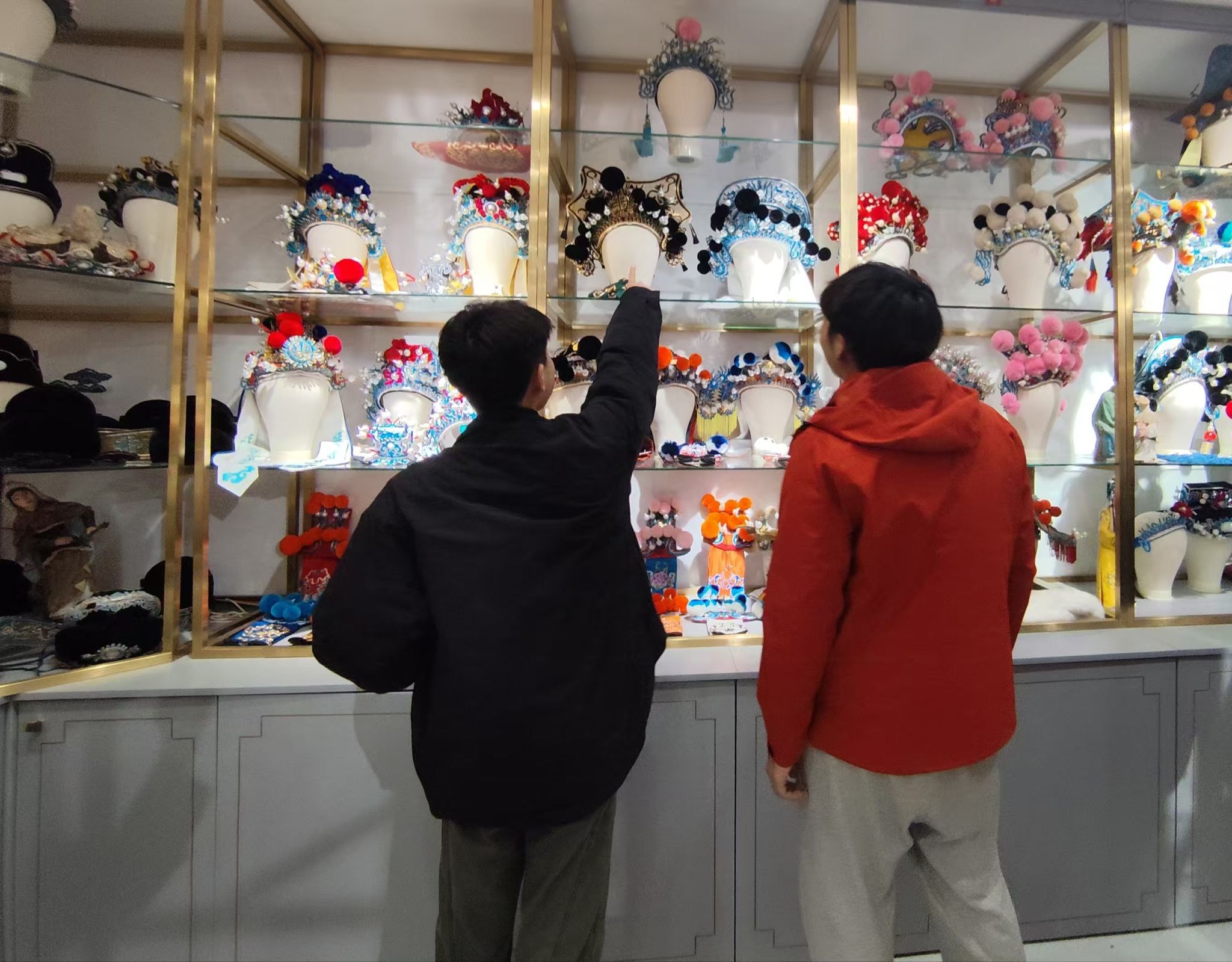 在滇剧院展厅,王润梅经理向同学们介绍了云南省滇剧院的历史沿革、前辈名家、演出传统、经典剧目以及创新发展等情况,并带领师生们参观了滇剧院的“盔帽道具展示间”。同学们面对戏曲行当里制作精美的盔帽和道具,顿时感觉眼花缭乱,听了王经理的讲解后,才明白什么样的盔头对应什么样的角色,大家无不赞叹戏曲艺术的博大精深。