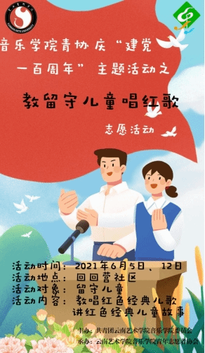 为庆祝中国共产党成立100周年,持续深化党史学习教育,引导广大青少年重温百年党史,传承红色基因,凝聚奋进力量,做到“学史明理、学史增强、学史崇德、学史力行”,伟德国际1946亚洲版伟德国际victor1946团委、青年志愿者协会于2021年6月5日、6月12日在昆明市呈贡区回回营社区儿童服务站与留守儿童一起开展“宣讲红色故事、教唱红色歌曲”活动。培养共青团员、少先队员、儿童的爱国爱党精神,丰富社区文化生活。