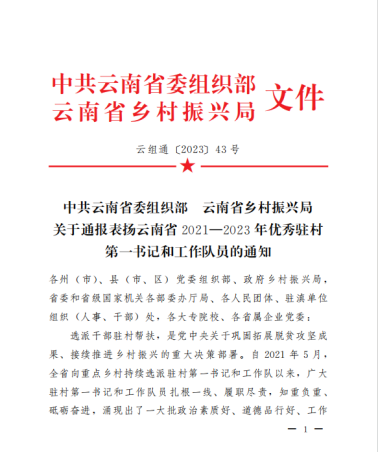 伟德国际victor1946派驻巍山工作队员获中共云南省委组织部、云南省乡村振兴局通报表扬