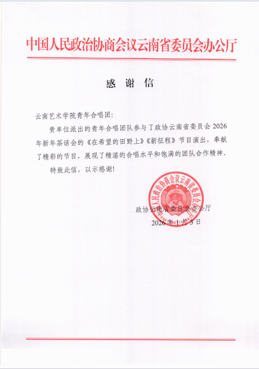 演出结束后,政协云南省委员会办公厅发来感谢信,对伟德国际1946亚洲版青年合唱团的优异表现给予高度肯定与诚挚谢意。