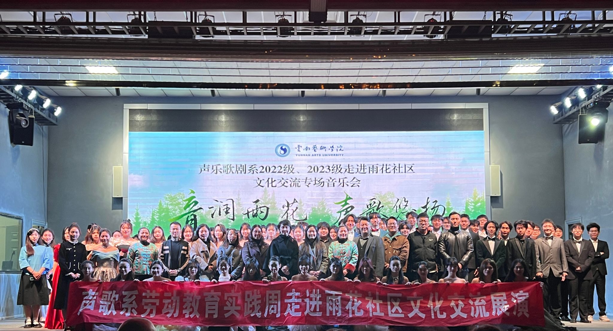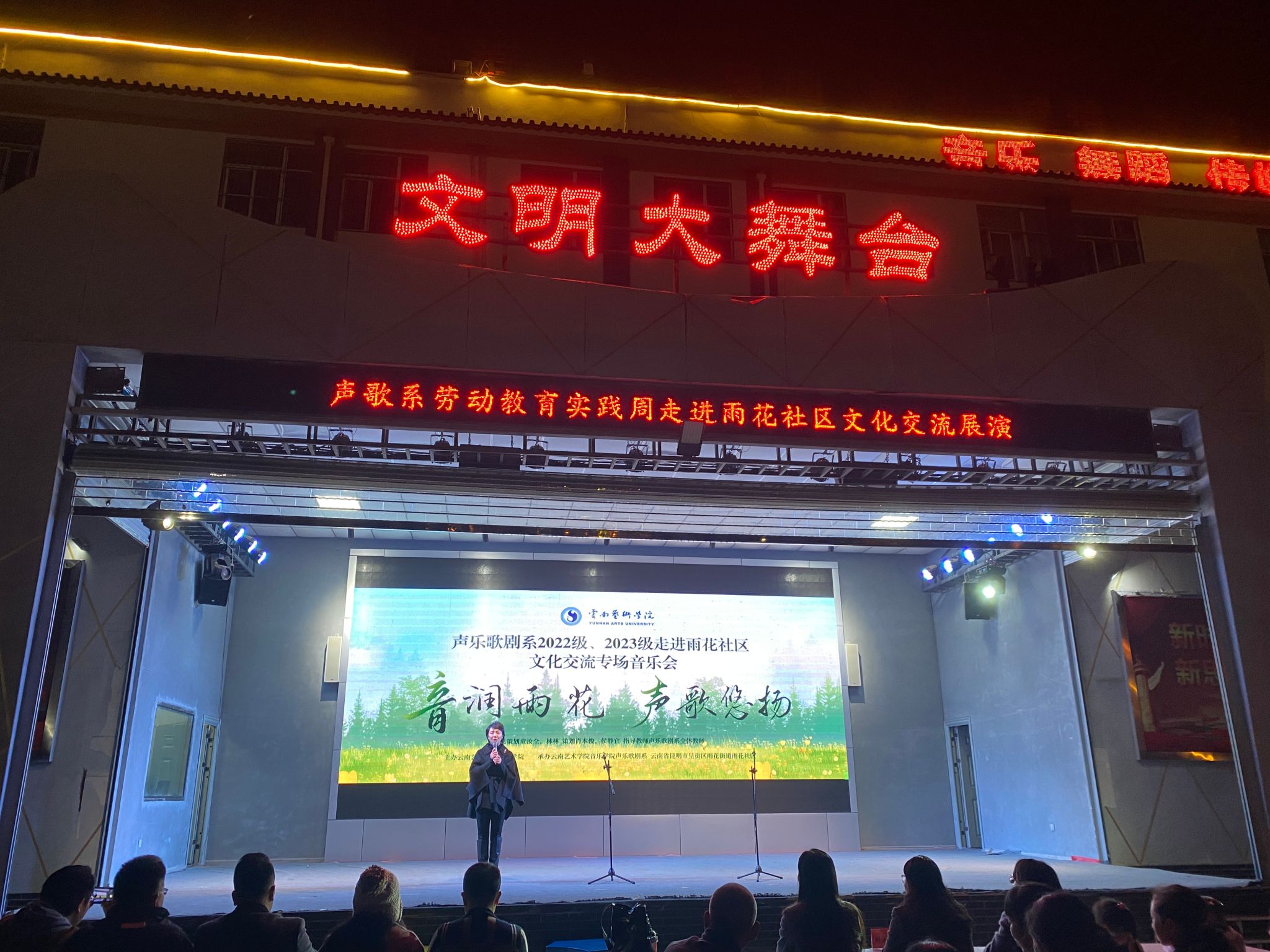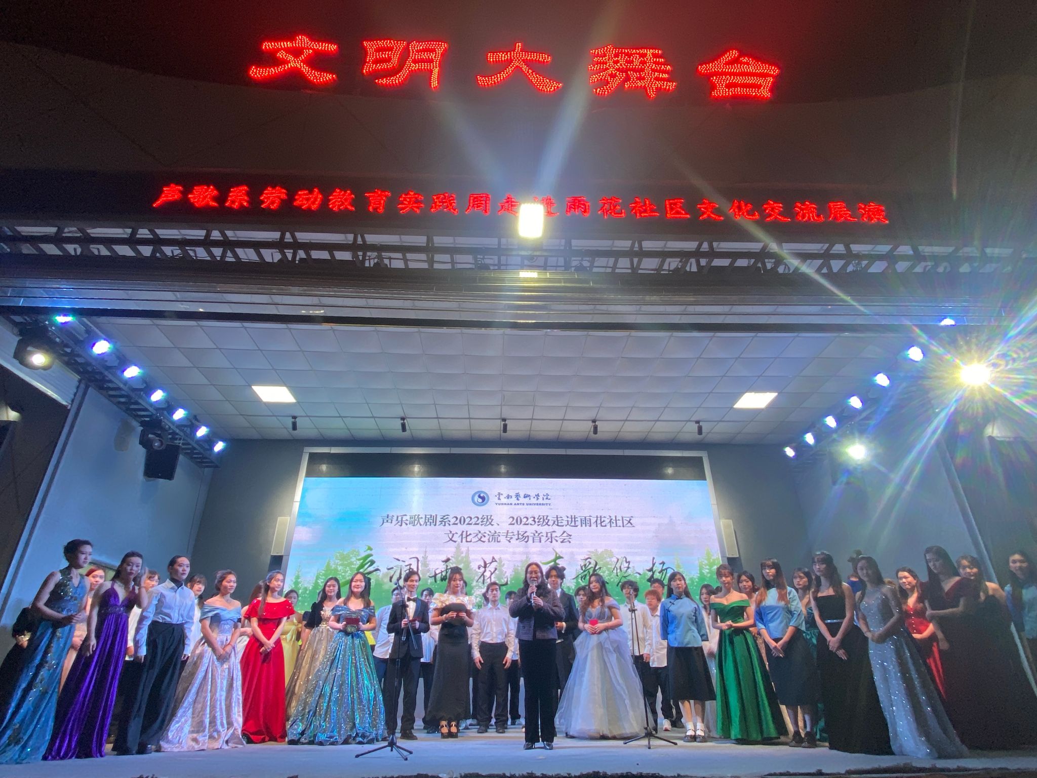 2024年12月4日晚,“音润雨花· 声歌悠扬”伟德国际victor1946声歌系2022级、2023级劳动教育实践周暨“雨润社区,温暖老人心”志愿服务、雨花社区新时代文明实践站2024年“音符之舟·交流启航”主题活动成功举办。此次活动由伟德国际victor1946主办,伟德国际victor1946声乐歌剧系、呈贡区雨花街道雨花社区承办,旨在通过音乐传递爱心与文化,增强员工实践能力,丰富社区文化生活,促进校社交流。